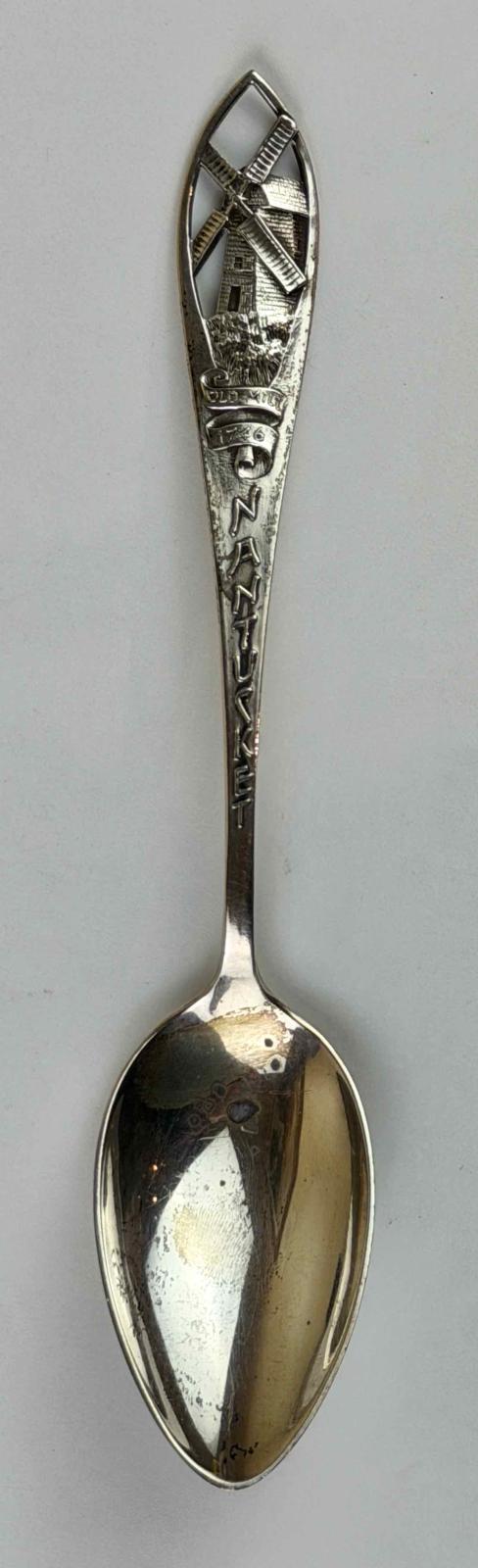 The spoon features the relief image of the wood-shingled Old Mill on Nantucket, believed to have been built in 1746 and the oldest operating mill in the United States. The handle is pierced to form the four vanes. The back of the spoon shows the back of the mill in relief.