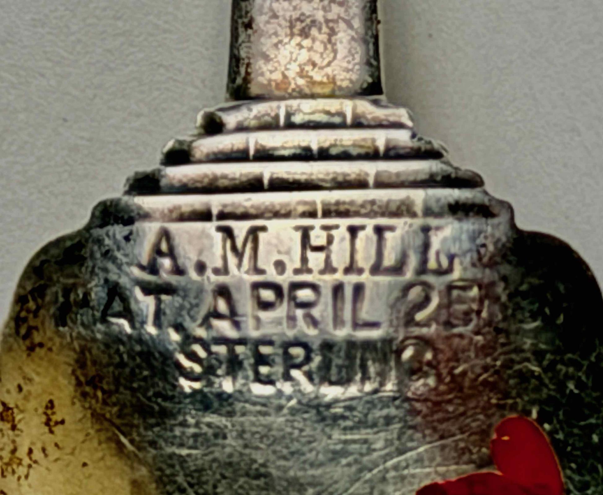 "NEW ORLEANS" is in the bowl. “A.M.HILL / PAT.APRIL 25’91 / STERLING” are on the back of the handle where it joins the bowl.