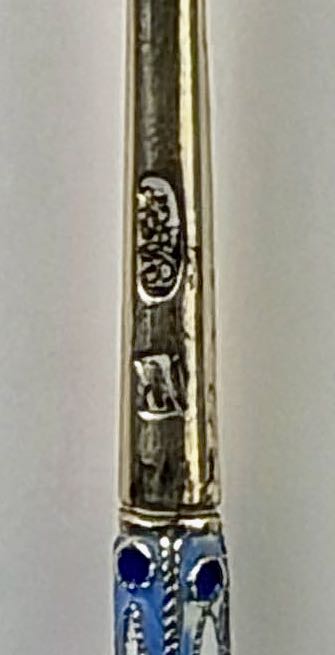The jewel-like appearance of this spoon was achieved by cloisonné work. Cloisonné is a centuries-old decorating technique in which metal barriers, evident in this spoon as beaded lines, hold in place colored enamels (or other materials).