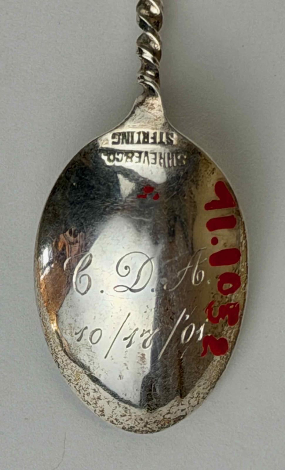 “SHREVE & CO / STERLING” stamped into the outside of the bowl at the attachment to the handle.