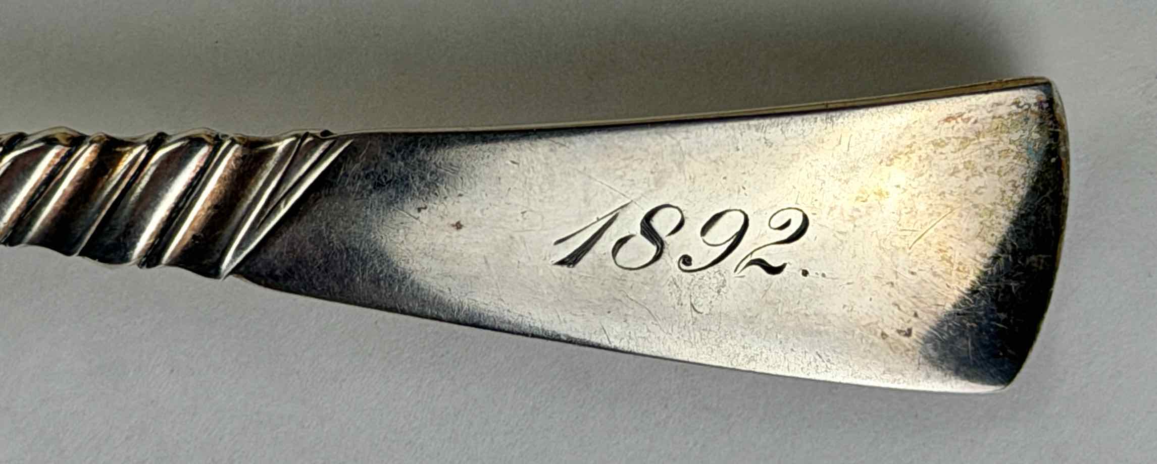 “San Francisco / California” is above and below the image in the bowl. The handle is engraved "1892" on the underside. Gorham hallmarks and “STERLING” are stamped into the underside of the bowl at the juncture of the handle.