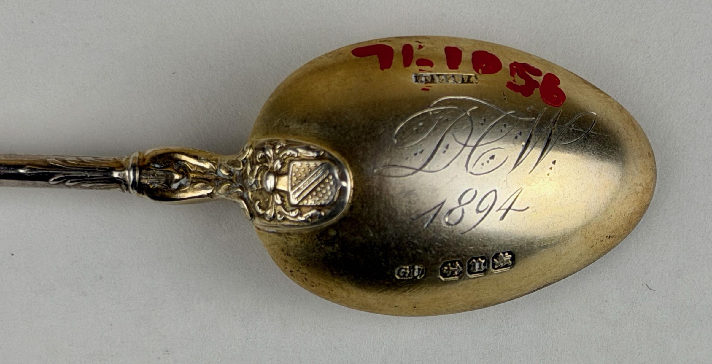 “Shakespeare’s House / Stratford-on-Avon” appears in the bowl below an image of the house. “DCW / 1894” is engraved on the outside bottom of the bowl. Below the engraving are four Birmingham silver hallmarks, including the 1894 date letter “u” and "GU." “RD152874” in relief within a rectangle is stamped above the engraved initials. “William Shakespeare” in raised lettering runs down the front of the handle.