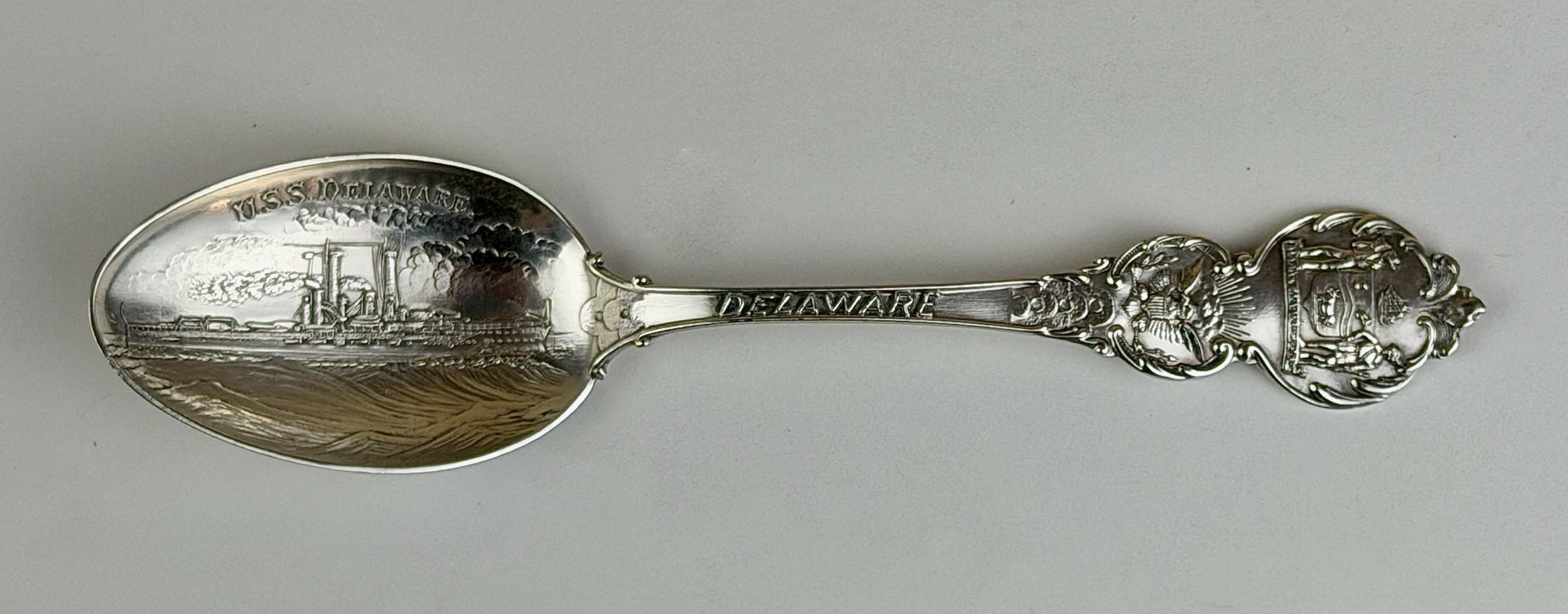 This souvenir spoon was made on the occasion of the docking of the USS Delaware in Philadelphia in October 1910. The warship had been launched in 1909, fitted out for the next year, and moved to Philadelphia for a celebratory commissioning. Its silver service (now at the Delaware State Archives) made by the Gorham Manufacturing Company was presented on October 3. Millard F. Davis, whose name appears on the spoon, was a watchmaker and jeweler in Wilmington, Delaware. He supplied the silver service as well.