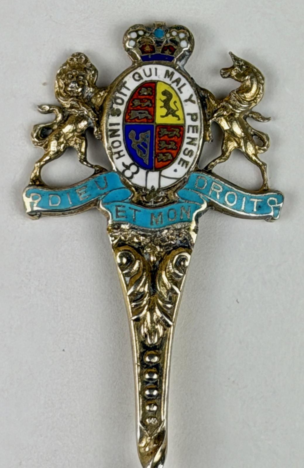 This spoon bears British inscriptions and elements of the royal seal, notably the English lion and Scottish unicorn with a crown between them. Although the subject of the souvenir spoon is an American battleship, it was made by Roden Brothers of Toronto.