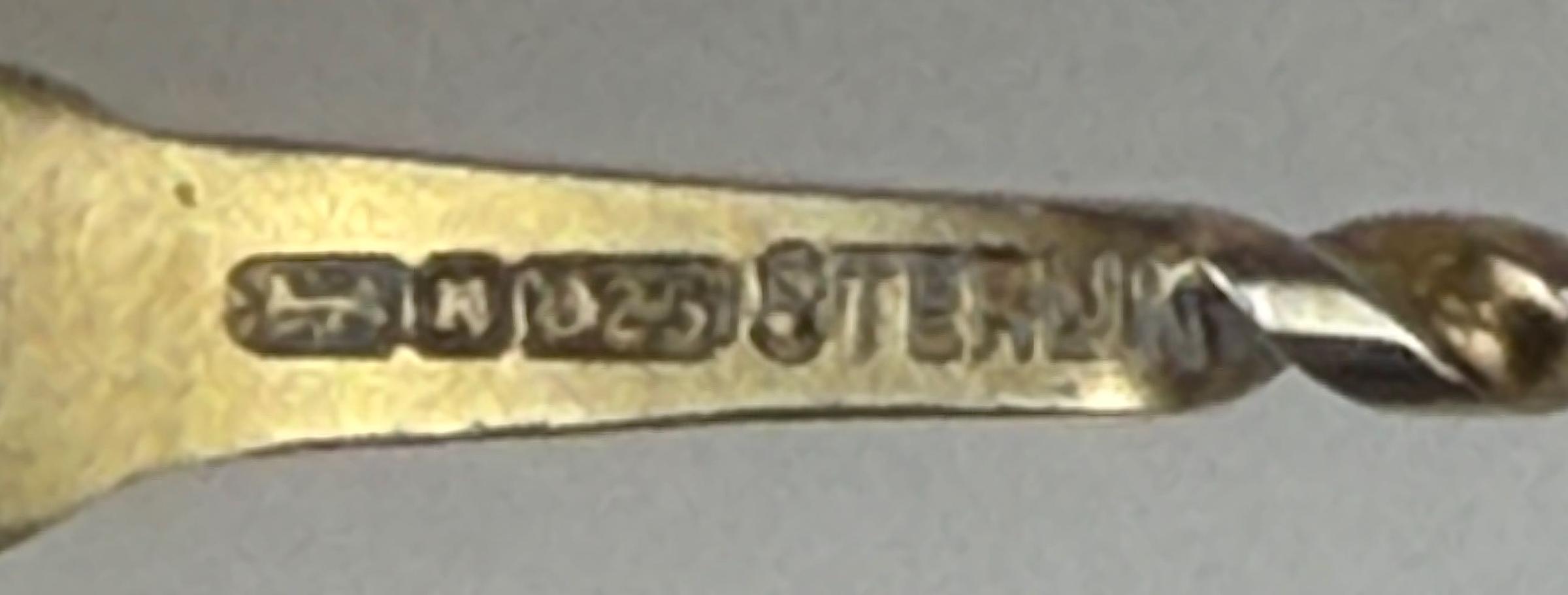 Of interest, the twist in the handle was made mechanically after the spoon had been die-struck and after the marks on the back of the handle had been struck. The word “STERLING” is distorted by the twisted metal.