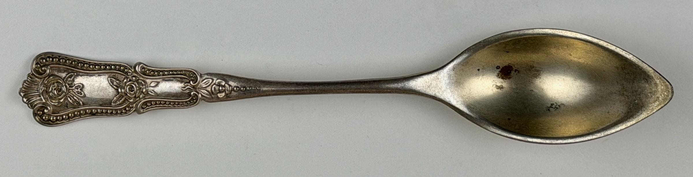 The spoon has a long bowl with a tapered end. The decoration on the handle incorporates two roses and beaded borders. The pattern is unidentified.
