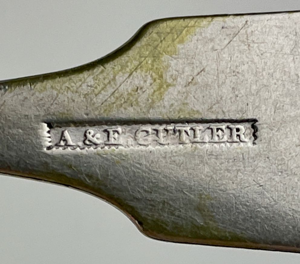 “RCS” in script is engraved into the end of the handle. “A & E CUTLER” is in relief within a serrated rectangle on the underside of the handle.