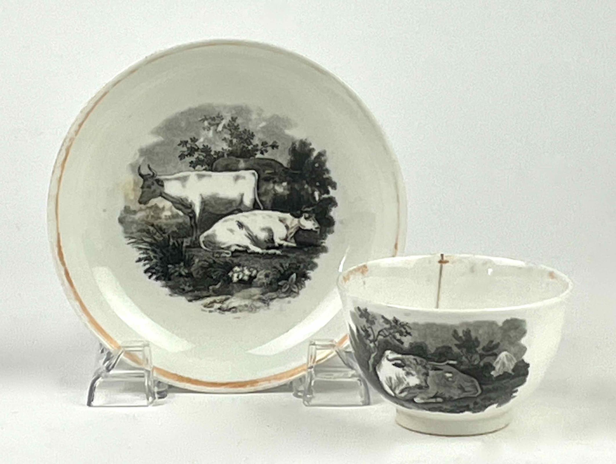 The transfer-printed cup and saucer have black-printed pictures of a cow and bull in bucolic settings. One the saucer, the bull is standing behind the cow that lies on the ground near a stream. On the cup, the cow and bull occupy separate images. A gilded band, which now appears to be a shade of orange, encircles the insides of both objects near the rim.