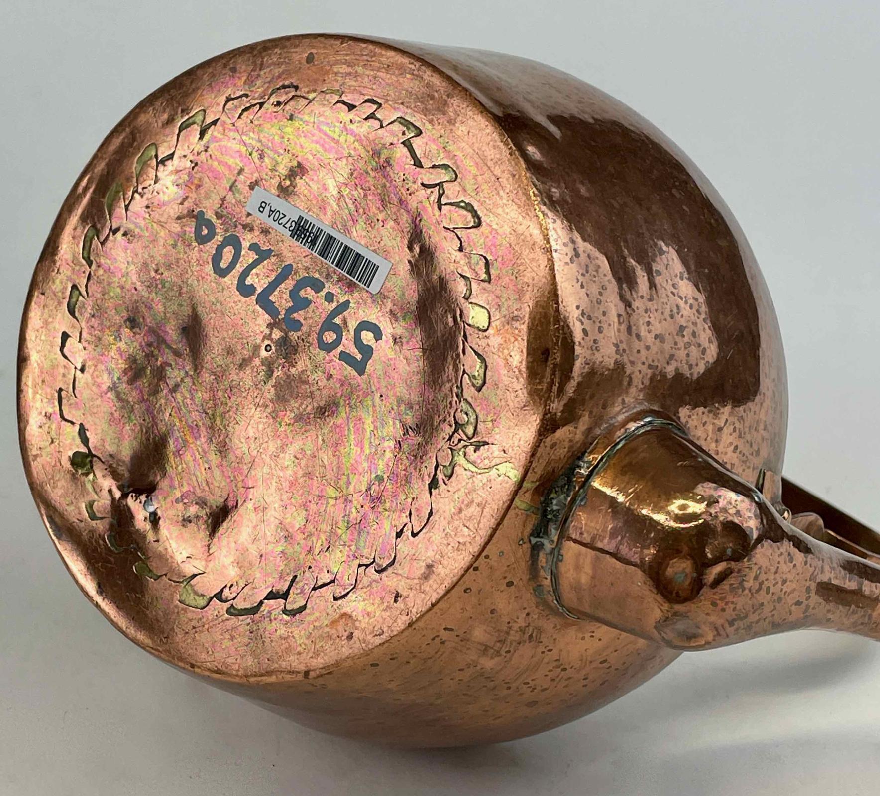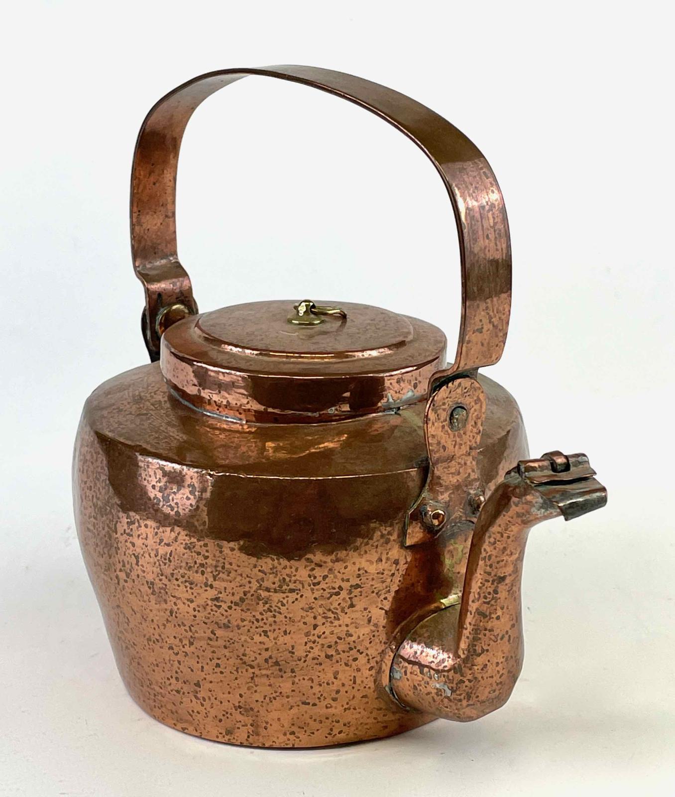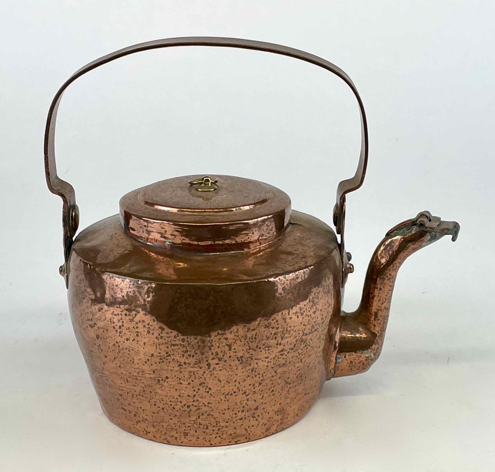 The tea kettle has a round, ovoid body with a sharp edge at the shoulder. The disk-shaped lid has a flat dome with a brass finial and ring. The C shaped strap handle is hinged at each end. The rivets holding the hinge tab are made of copper. The goose-neck shaped spout has a hinged cover. The body is seamed in front. A separate piece of copper is held onto the bottom by soldered "dovetail" tabs that lean in one direction, rather than being positioned at right angles. The inside of the kettle is coated in tin.