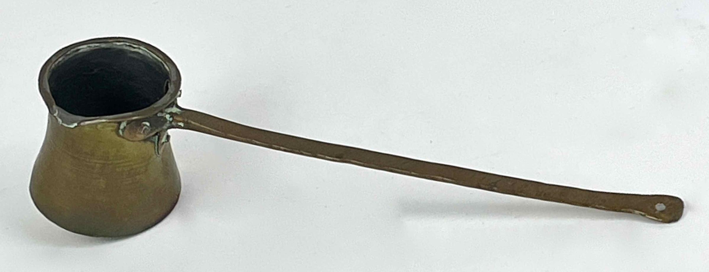 The form and manufacture of this object are simply foreign to Western metalwares of the 18th or 19th centuries. Its design has no early counterpart. The crude workmanship visible on the handle is not at all typical of Western metalwork. Use of iron rivets rather than copper or brass is likewise unusual. All of these and other issues find resolution when this object is compared to Turkish coffee pots, a form called a cezve (“jezz-vah”), made to brew single servings of coffee from very fine grounds. Although the cezve looks similar to a modern butter warmer, there is no historical relationship that informs this object.