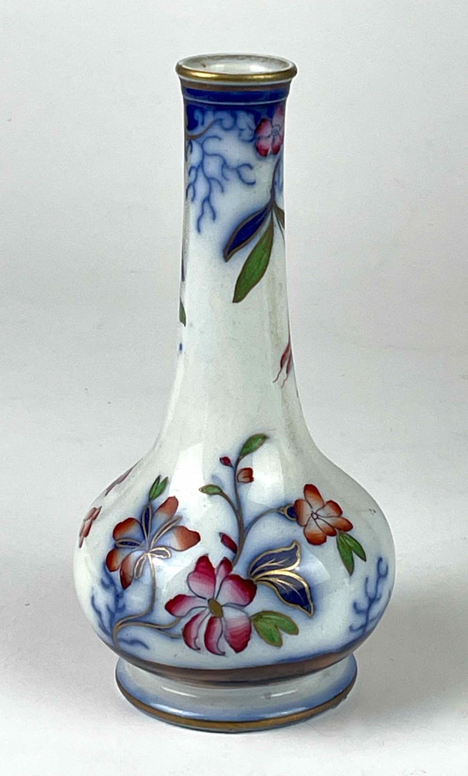 The tall, slender necked white vase has a bulbous bottom and is decorated in green, pink, and blue flowers with gold highlights. The mouth and flared foot have gold rings.