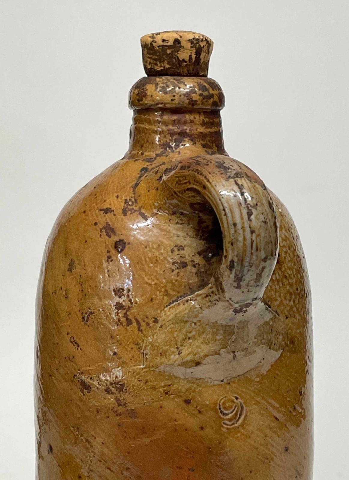 The tall cylindrical jug with an applied handle and a detailed molded lip was produced for the sale of mineral or similar water.
