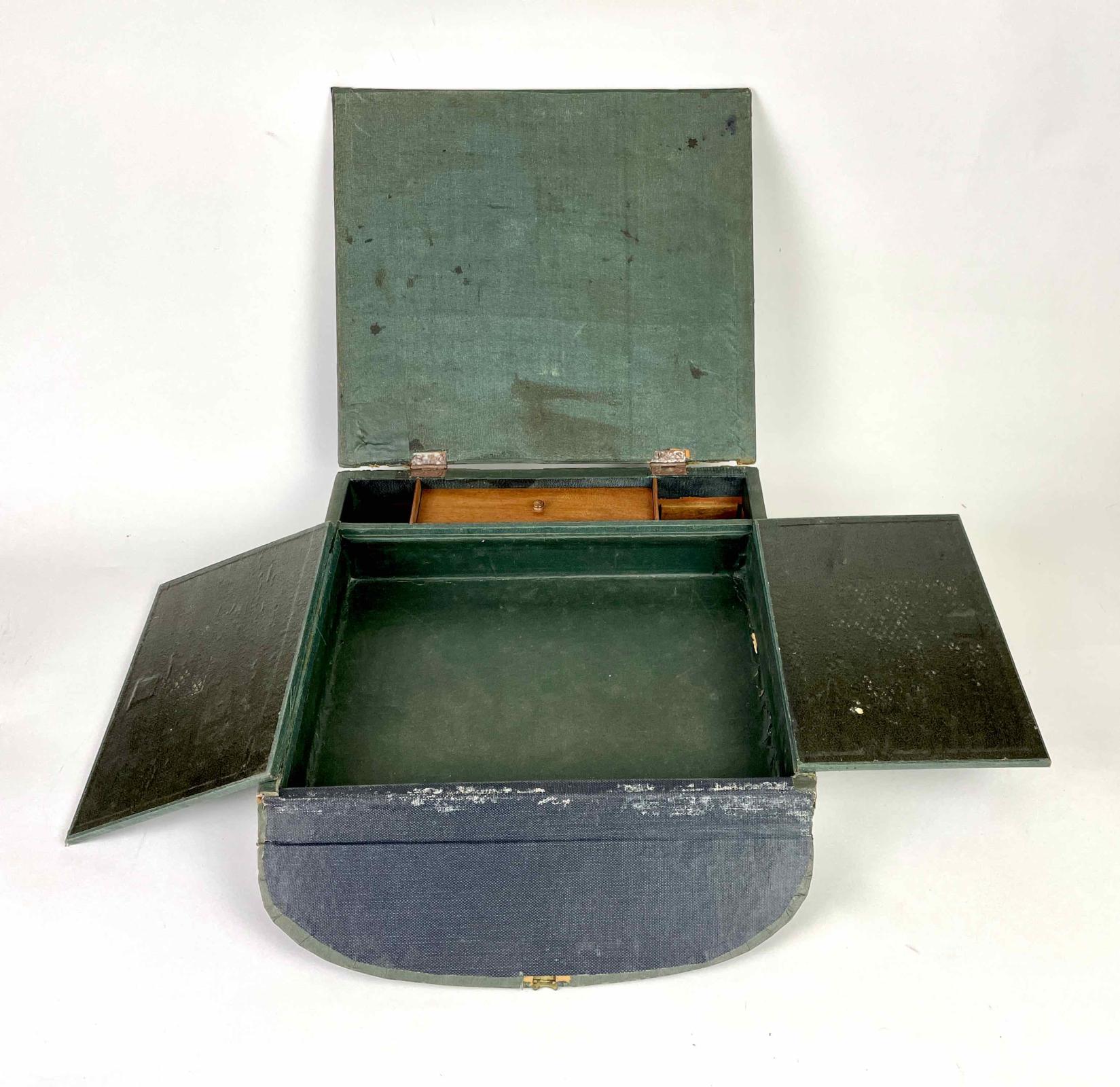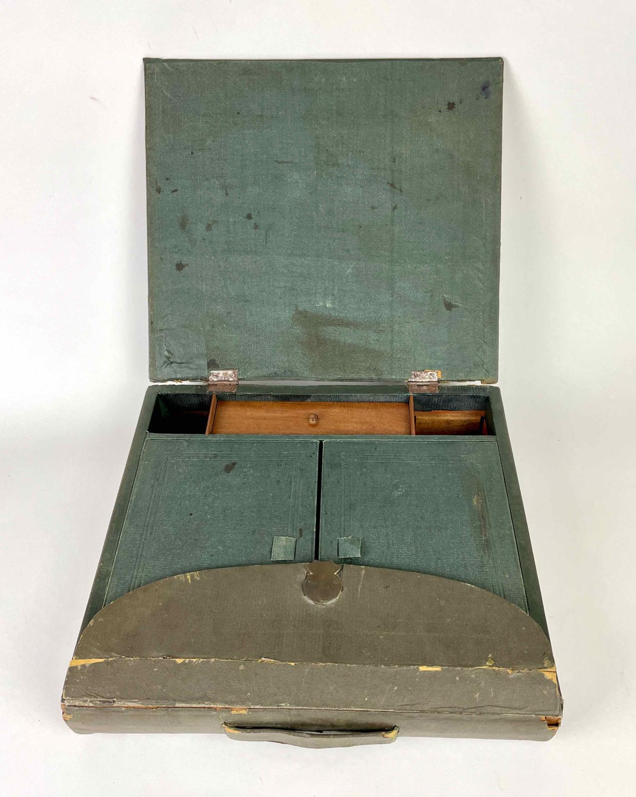 The dark green writing box has a locking flap that, when unfolded, allows the case to be opened to compartments at the top for pens, ink, and other writing implements. Hinged flaps open to a compartment for letters and papers.