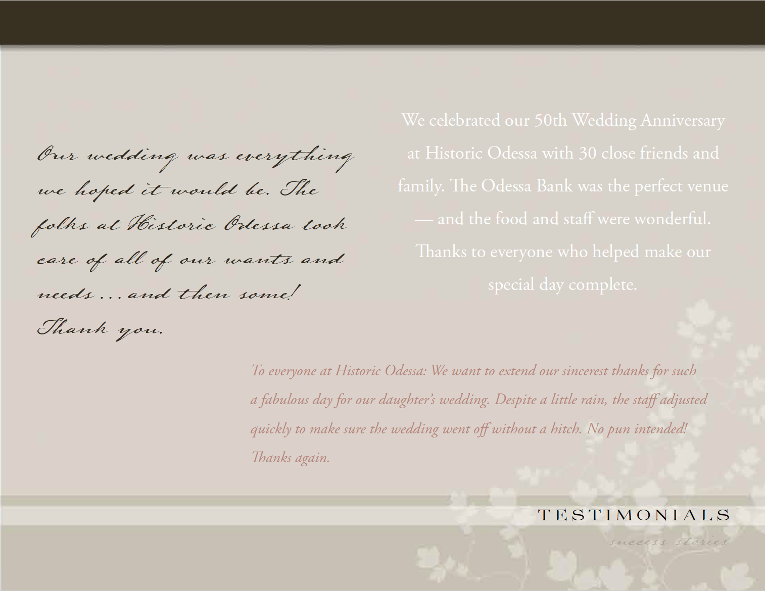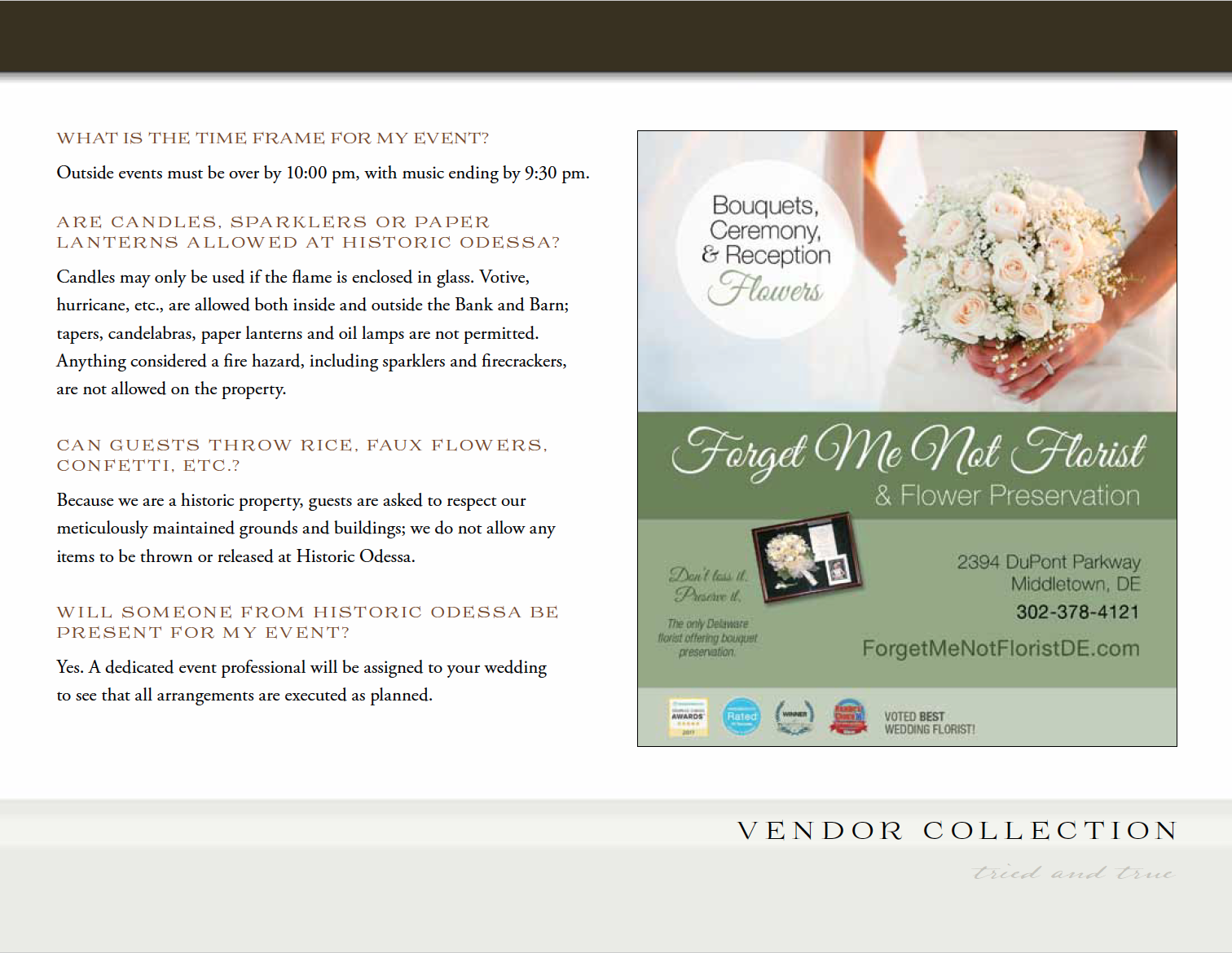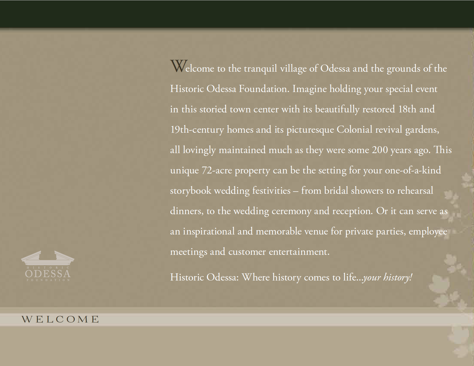 Historic Odessa is a one-of-a-kind special event venue. To learn more about how we can help you plan your wedding festivities, meetings or other special occasions, please contact Jennifer Cabell at (302) 378-4119.