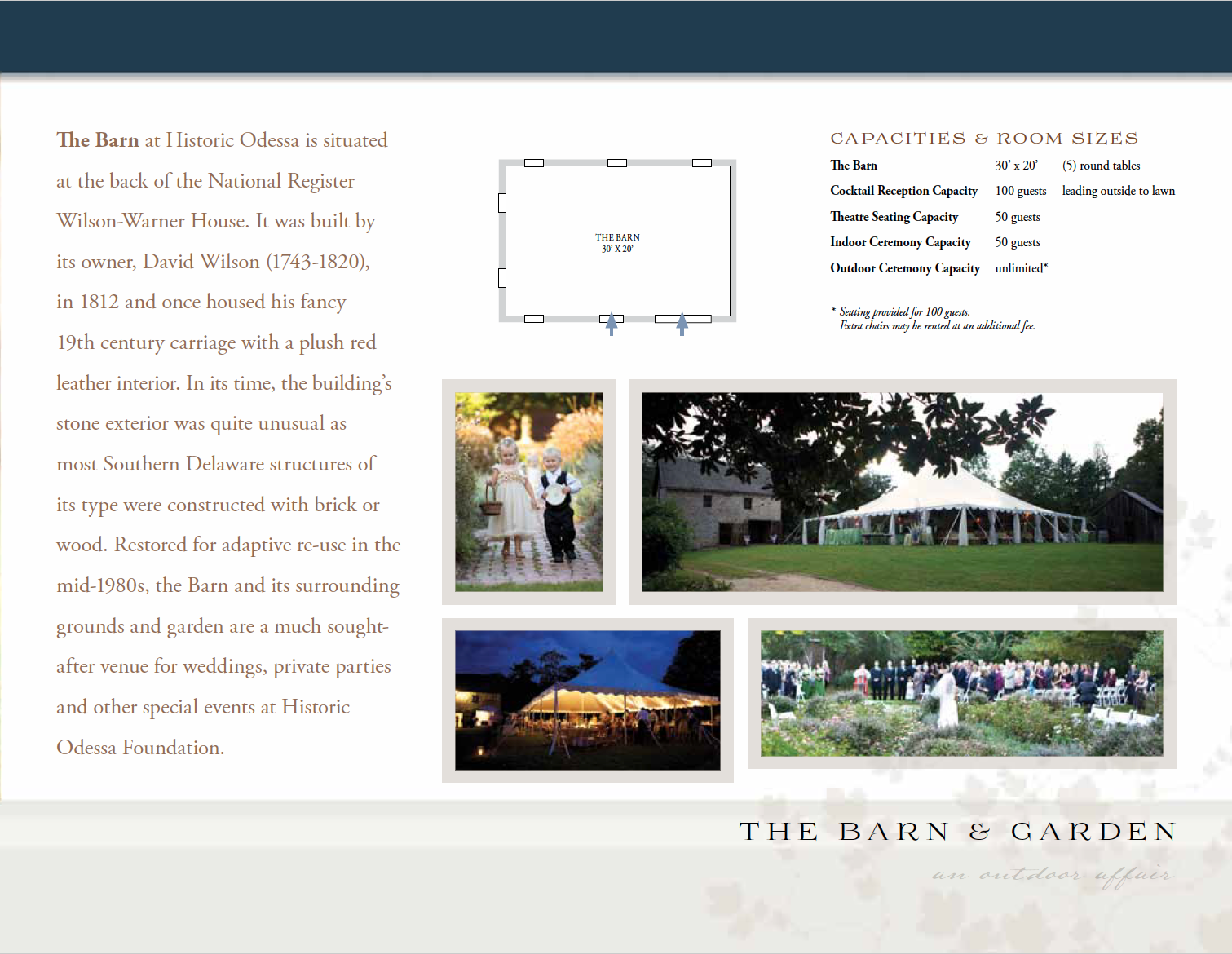 The venue has expansive outdoor space, including The Barn, at the back of the National Register Wilson-Warner House. Built by its owner, David Wilson (1743-1820), in 1812 it once housed his fancy 19th century carriage with a plush red leather interior. In its time, the building’s stone exterior was quite unusual as most Southern Delaware structures of its type were constructed with brick or wood. Restored for adaptive re-use in the mid-1980s, the Barn and its surrounding grounds and garden are a much sought-after venue for weddings, private parties and other special events at Historic Odessa.